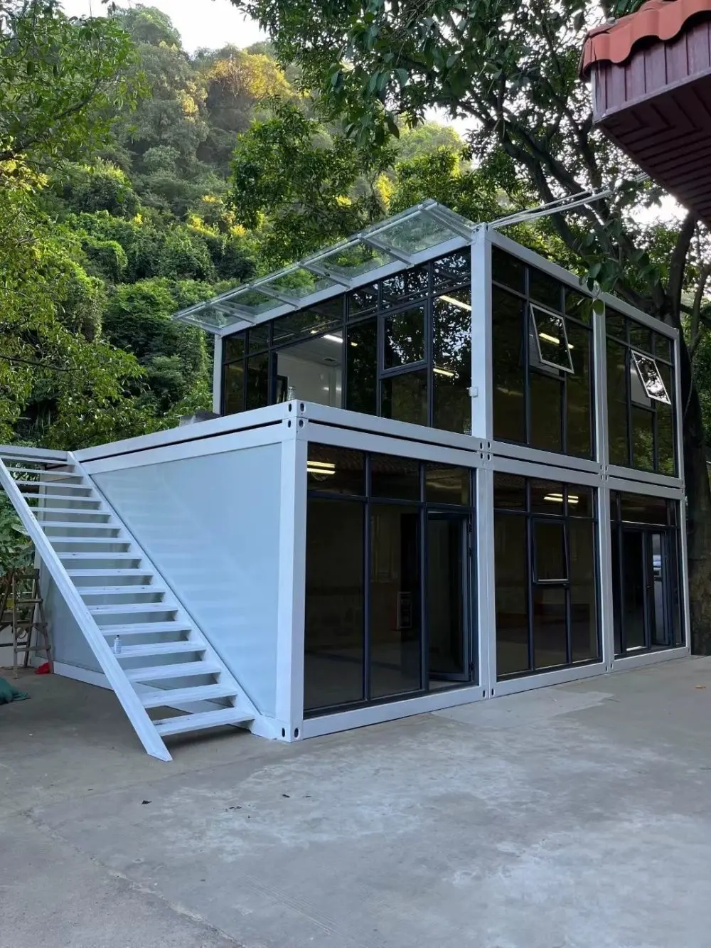 „1. Modulares Verbindungsdesign für maximale räumliche Freiheit: Basierend auf Standardcontainern als Grundeinheit ermöglicht eine spezielle Verbindungsstruktur unbegrenzte horizontale Verbindungen und bis zu vier vertikale Stapelebenen. So lassen sich vielfältige Gestaltungsmöglichkeiten realisieren, wie z. B. Split-Level-Anordnungen, zurückgesetzte Bereiche, auskragende Räume und verbundene Korridore. Der Innenraum kann zu einem stützenfreien Großraum geöffnet werden und eignet sich perfekt für große Büros auf ebenerdigen Ebenen, offene Ladenlokale und zweigeschossige Gewerbekomplexe. Verabschieden Sie sich von den Einschränkungen herkömmlicher Containerkonstruktionen und genießen Sie eine Raumnutzungs- und Layoutflexibilität, die weit über traditionelle Containerkombinationen hinausgeht.“